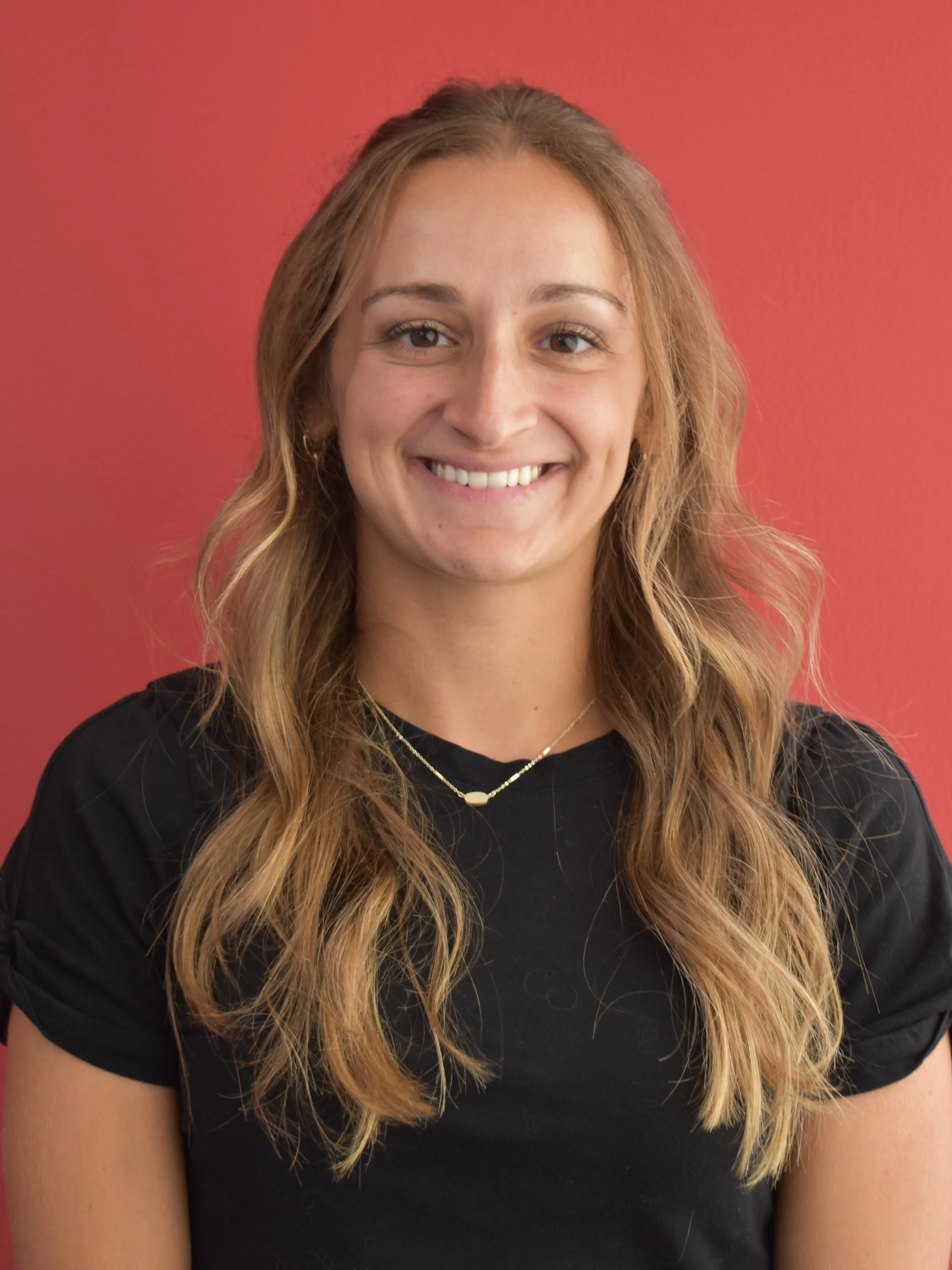 A woman with short brown hair smiling, wearing a black collared shirt, against a red background.